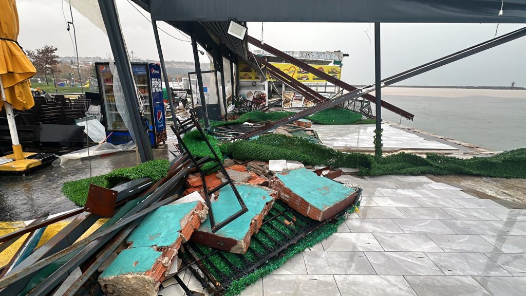 Meteoroloji Genel Müdürlüğü tarafından yapılan turuncu uyarı sonrasında başlayan fırtına ve sağanak yağış nedeniyle, Tekirdağ’da sahil dolgu alanda bulunan işletmeler zarar gördü.