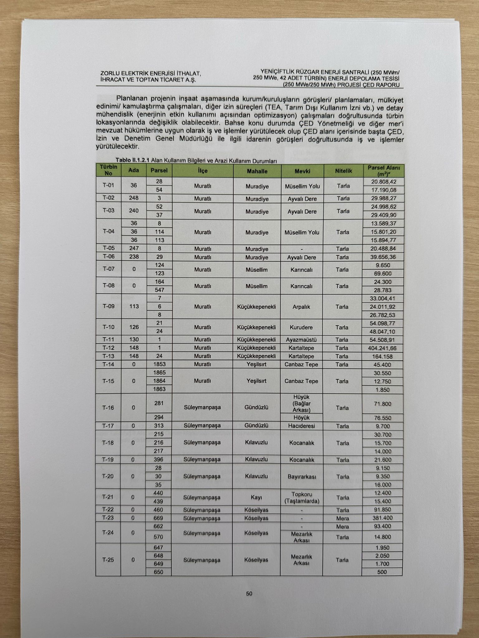 ÇED raporundaki tablolara göre sadece Muratlı’daki Muradiye, Ayvalıdere, Karnıcalı, Küçükpeçenekli gibi kırsal mahallelerde, her biri 20 bin ile 400 bin metrekare arasında değişen parseller türbin sahasına dönüştürülecek. Süleymanpaşa ilçesindeki Gündüzlü, Kılavuzlu, Kayı ve Köseilyas gibi bölgelerde de aynı şekilde büyük tarım arazileri türbinlerle dolacak.